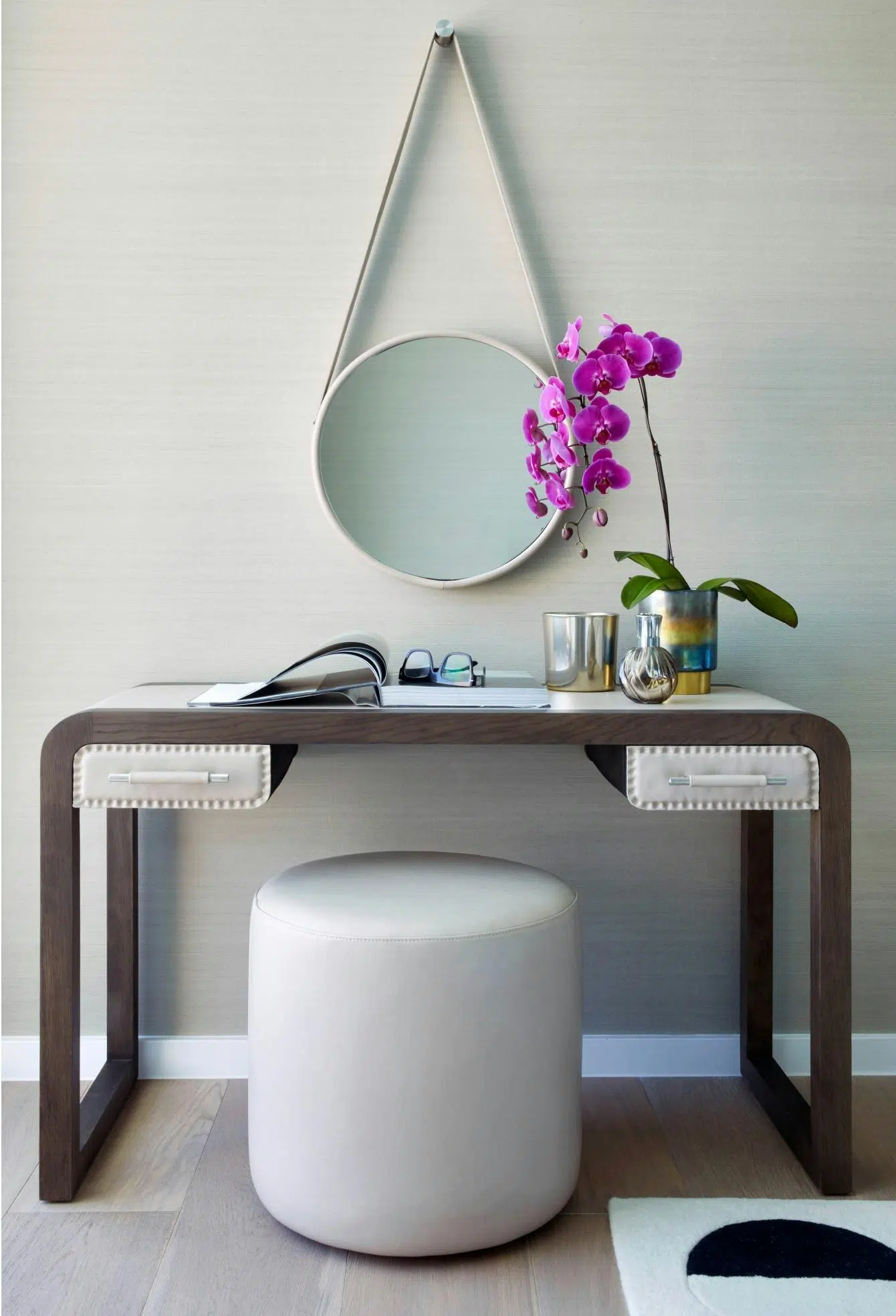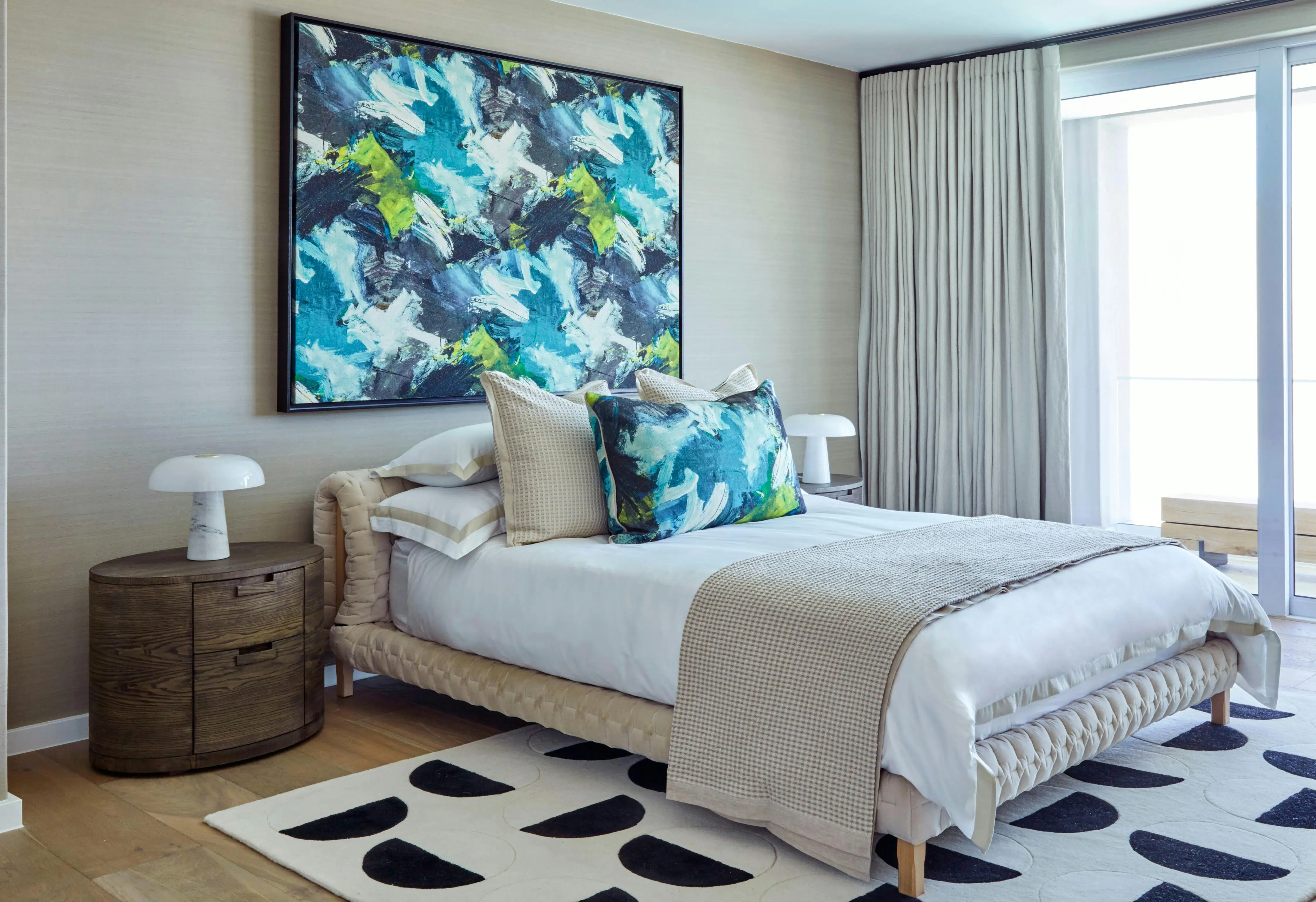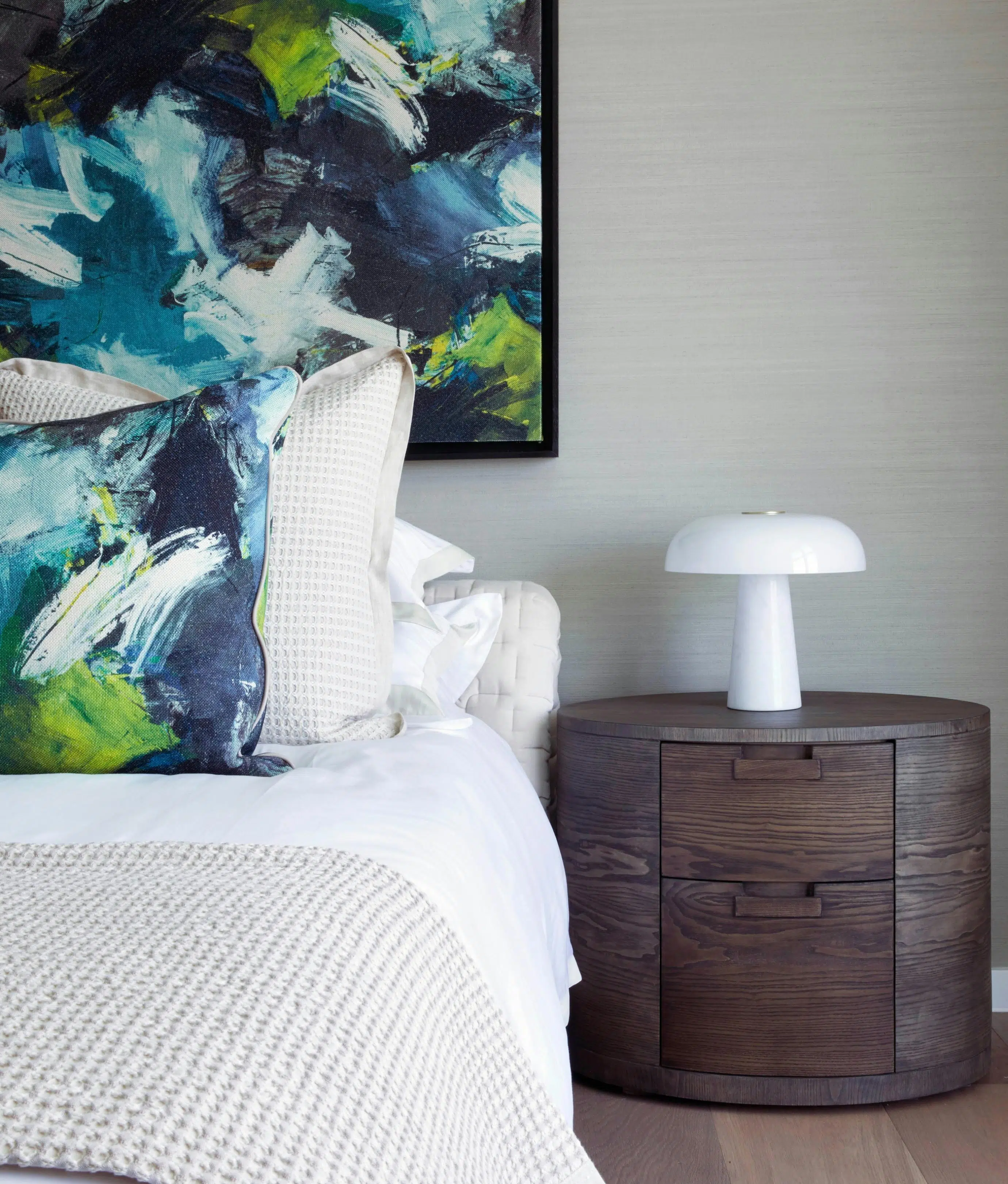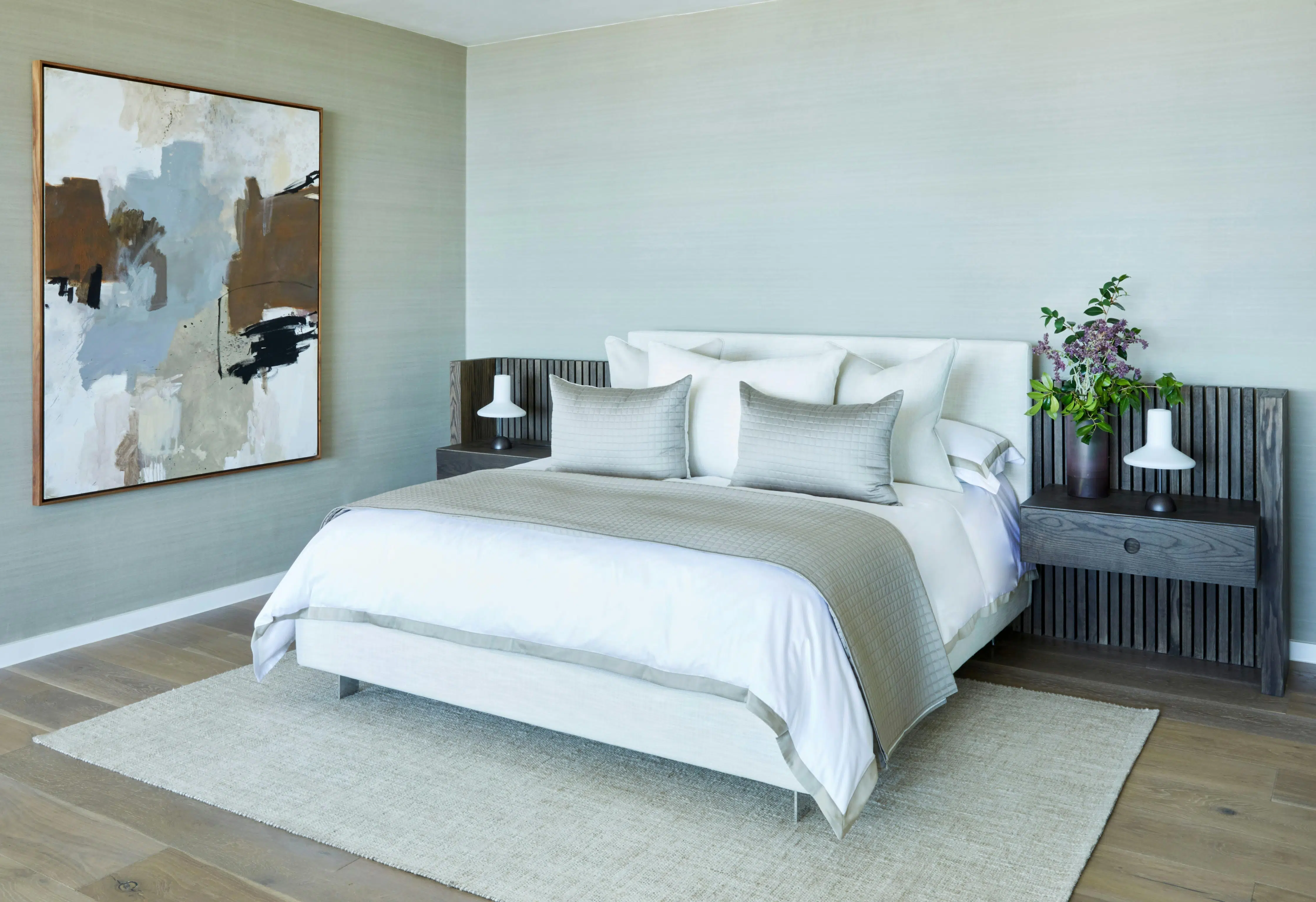 Natural textured wallpaper wrapped the walls, infusing the space with warmth and a comforting atmosphere.